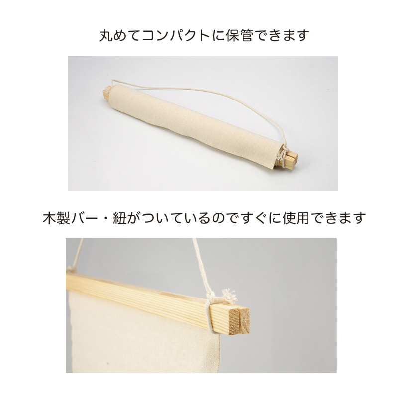木製バー・紐が付いているのですぐに使用でき、丸めてコンパクトに保管もできますよ!