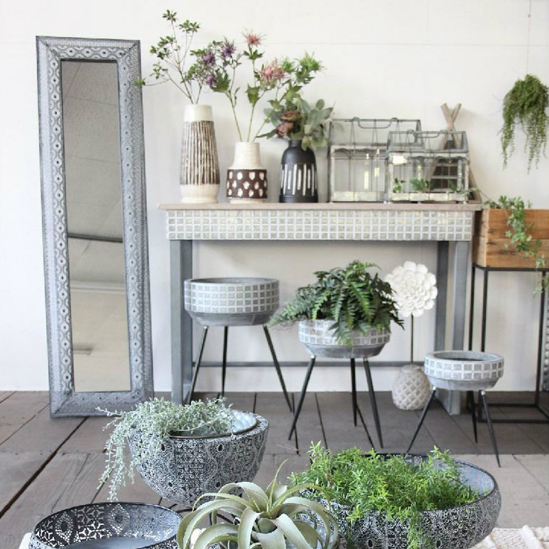 植物をブリキなどのシルバーやグレーの色合いと合わせることでオシャレ空間に…。