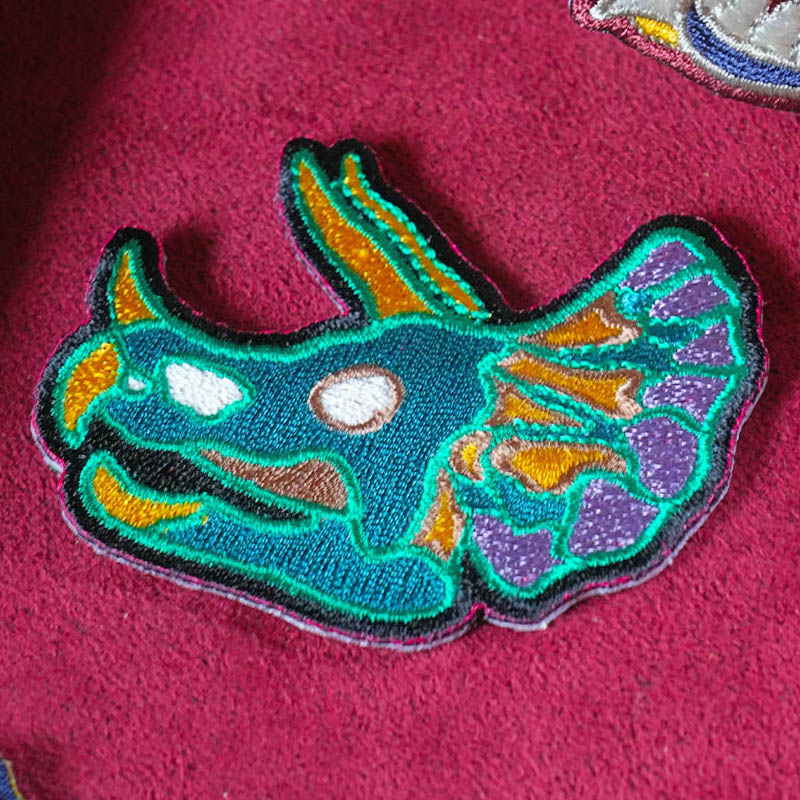 古代の息吹を刺繍で表現したワッペンは、一枚でも迫力満点。