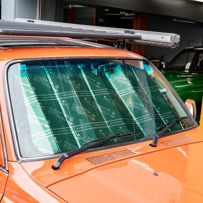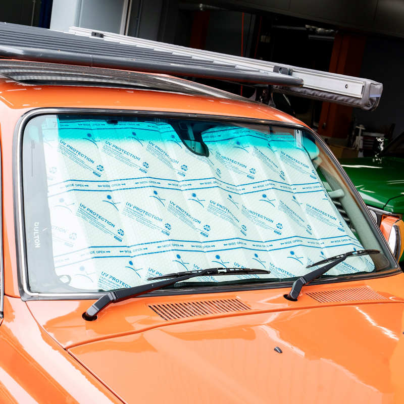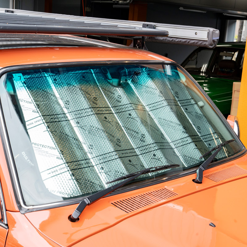 真夏の炎天下でも、サンシェードを使用することで車内の温度上昇を抑えたり、