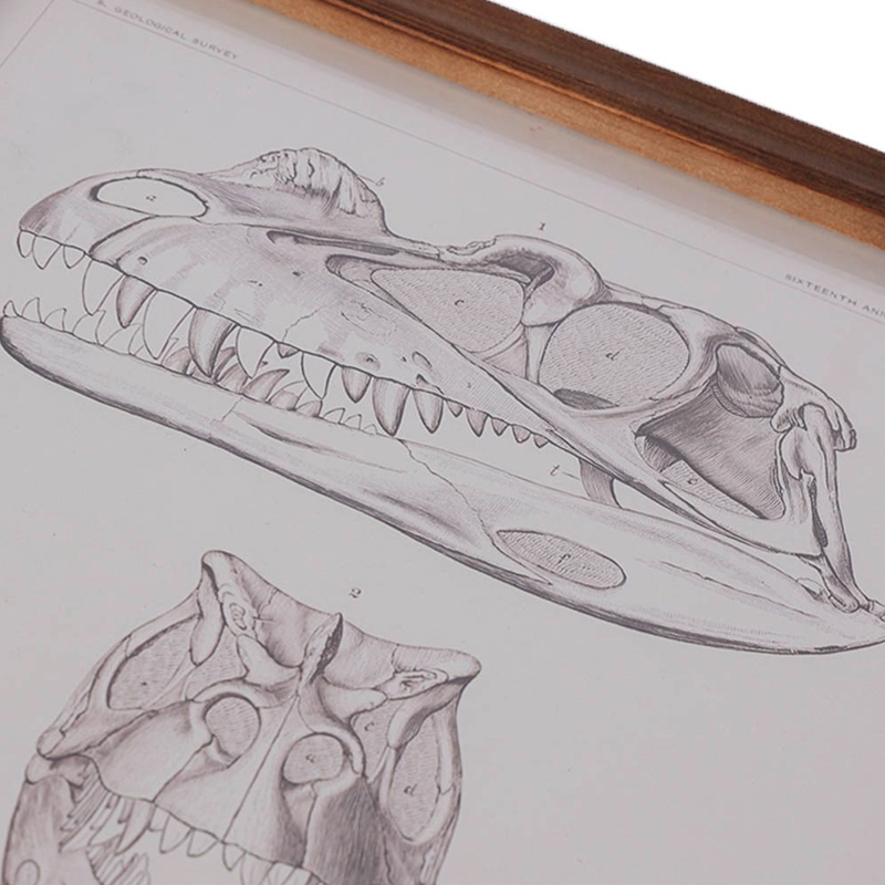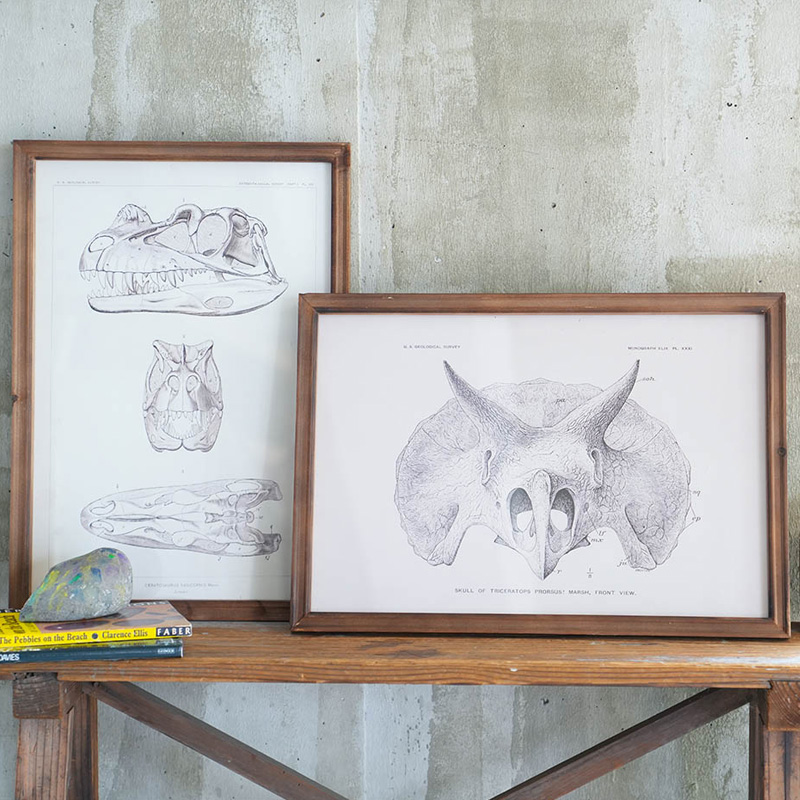 骨格や化石、断面図を描いた古書の図版を、アートフレームに仕立てました。