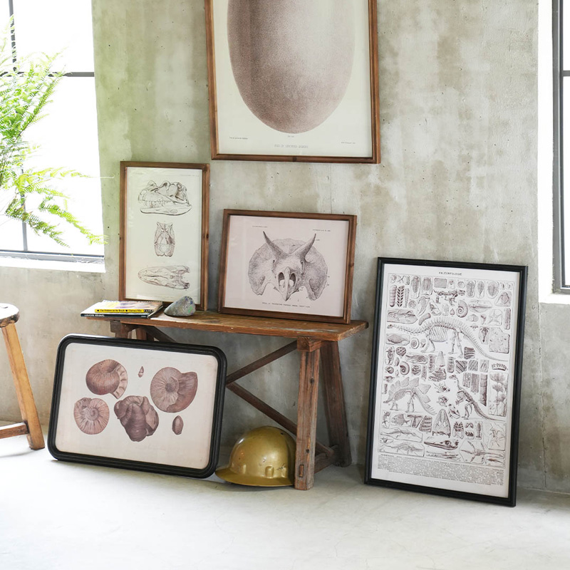 骨格や化石、断面図を描いた古書の図版を、アートフレームに仕立てました。