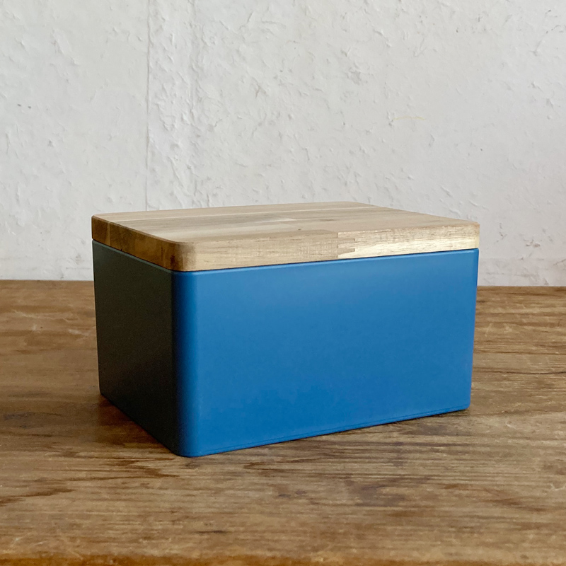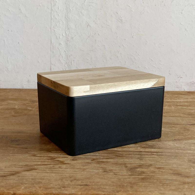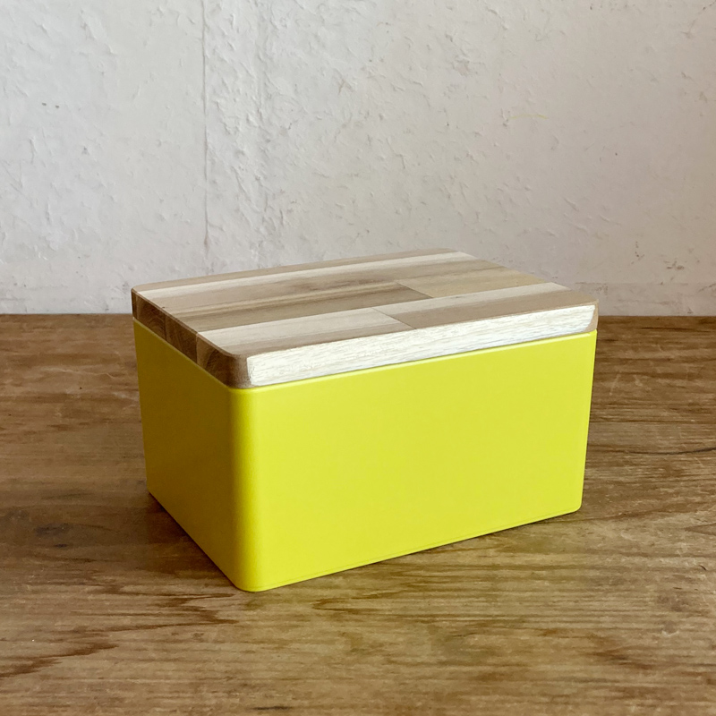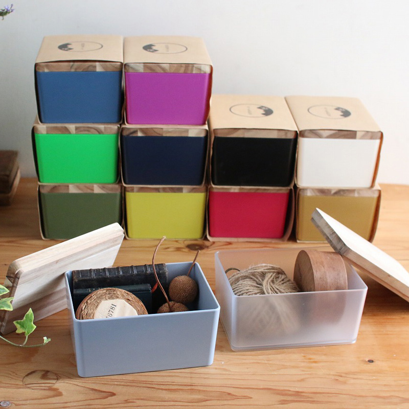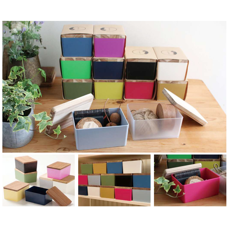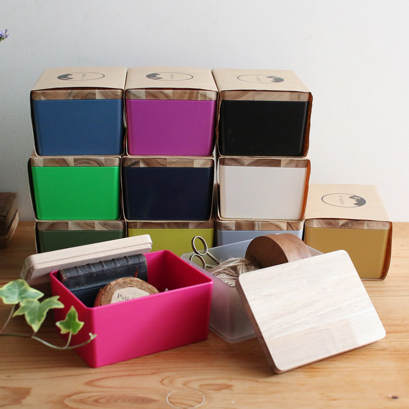 天然木のフタが付いた樹脂の色合いが綺麗な収納ボックス。