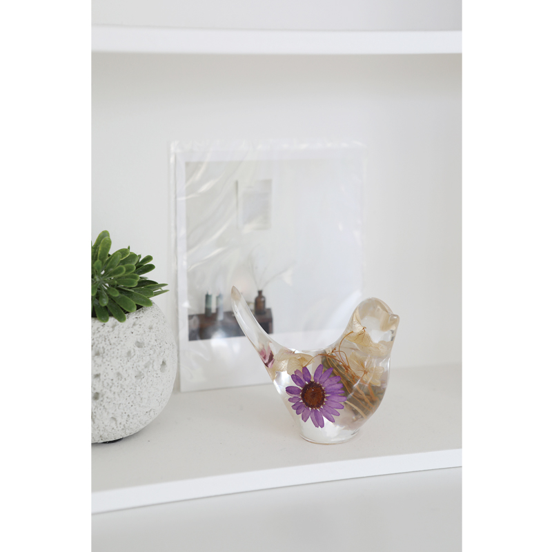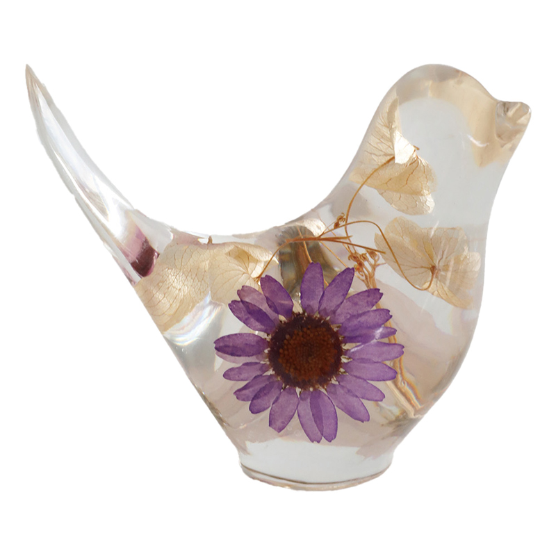 樹脂の中に可憐なドライフラワーを詰めた鳥のオブジェ。