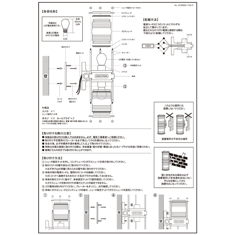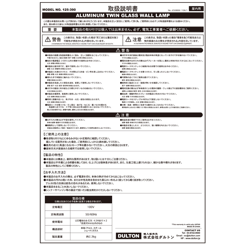 使用電球:LED電球 ×2pcs (MAX4.5W/E26 ※L.90mm以内)