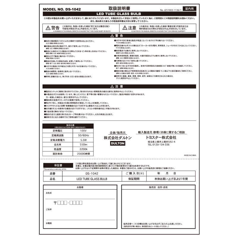 ■ダルトン■■2026SS 新作■ LED Tube glass bulb