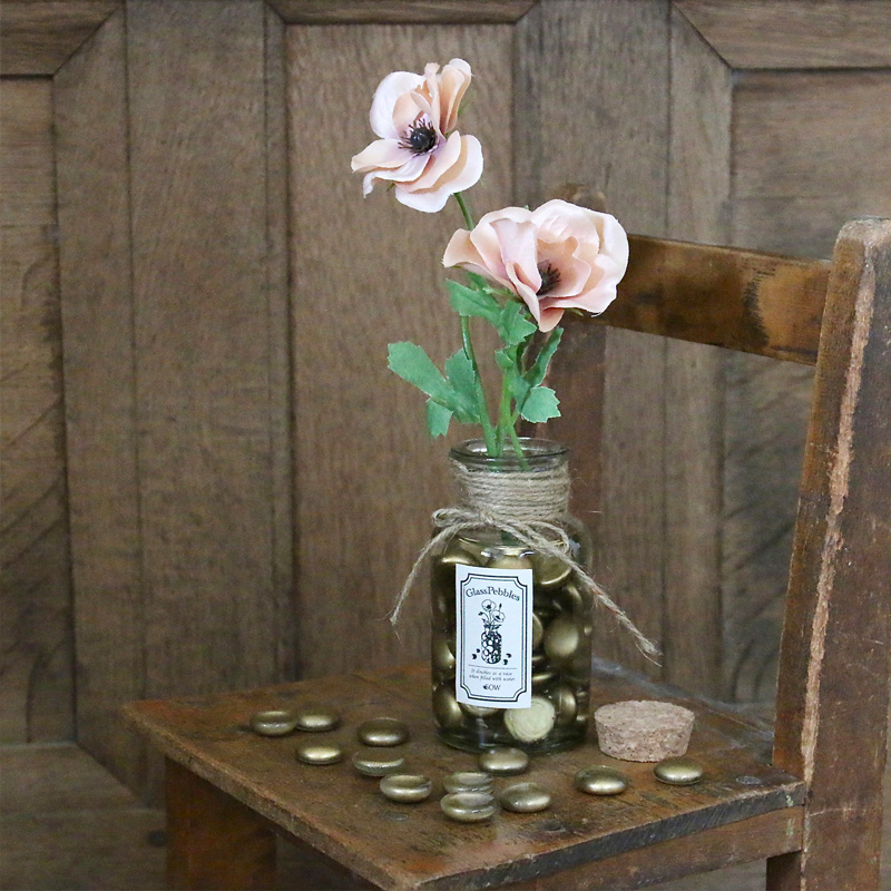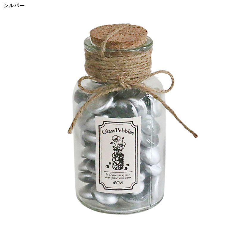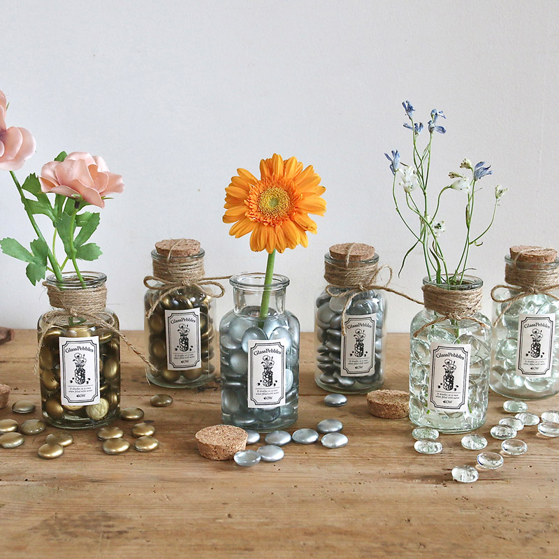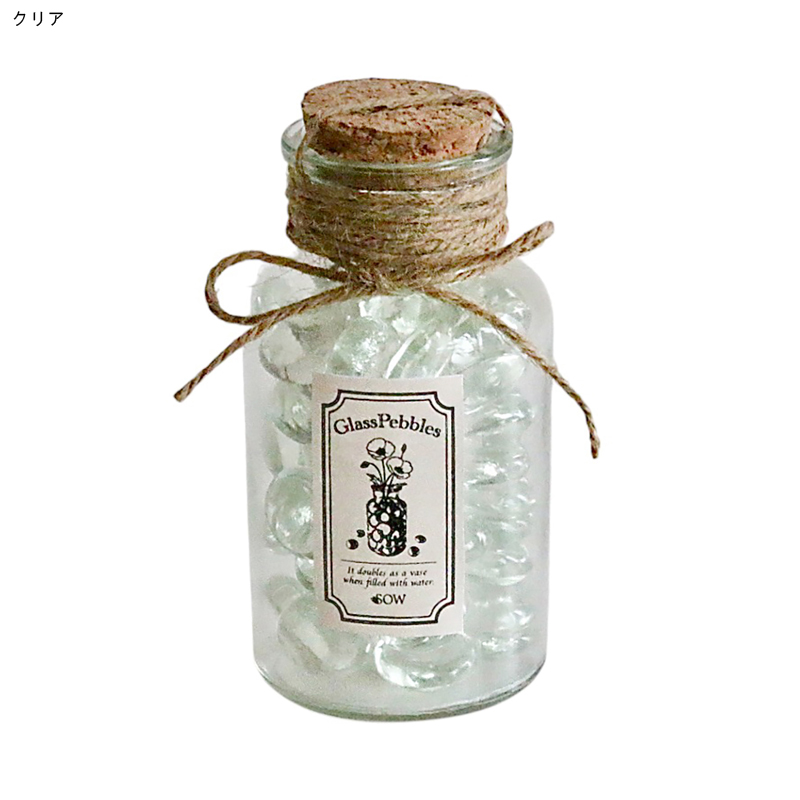 コロンと可愛いガラスのペブル(小石)が詰まったコルクボトル。