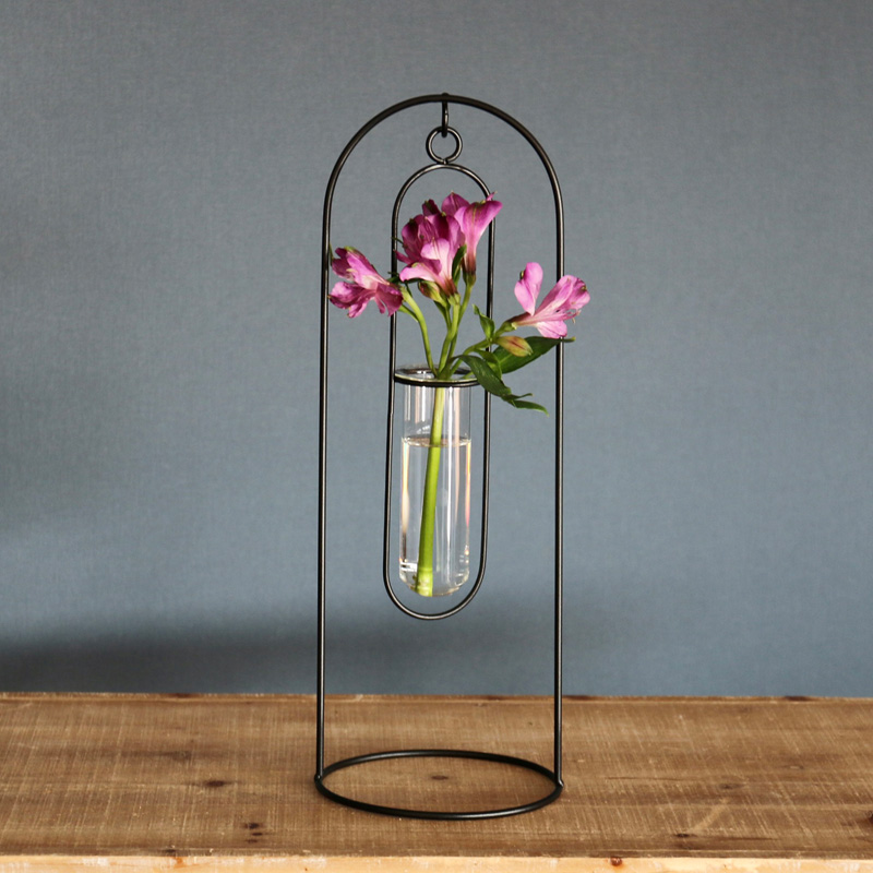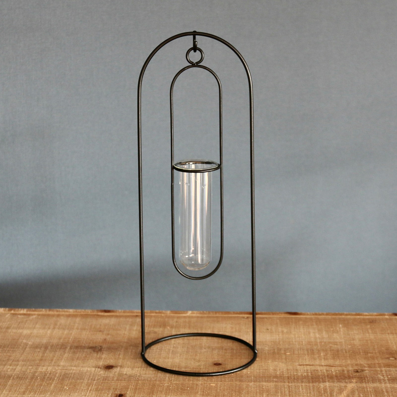 スリムなガラスベースと軽やかないアイアンスタンドを組み合わせたアイテム。
