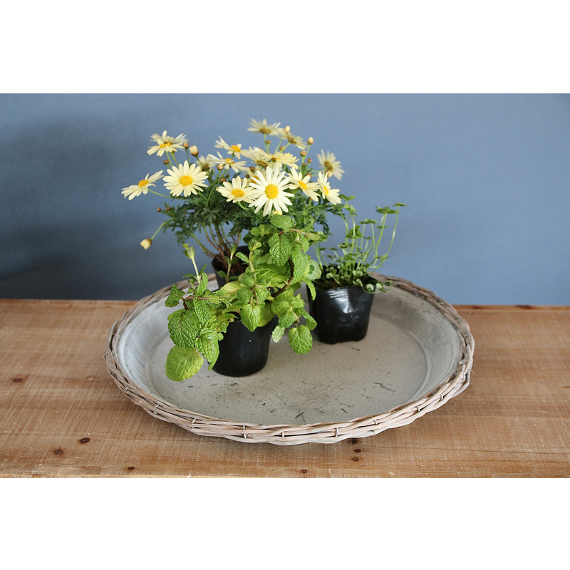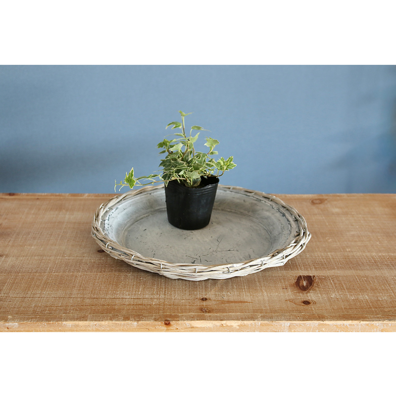 ヴィンテージ感あふれるブリキの周りに柳のカゴ編みをあしらったトレイ。
