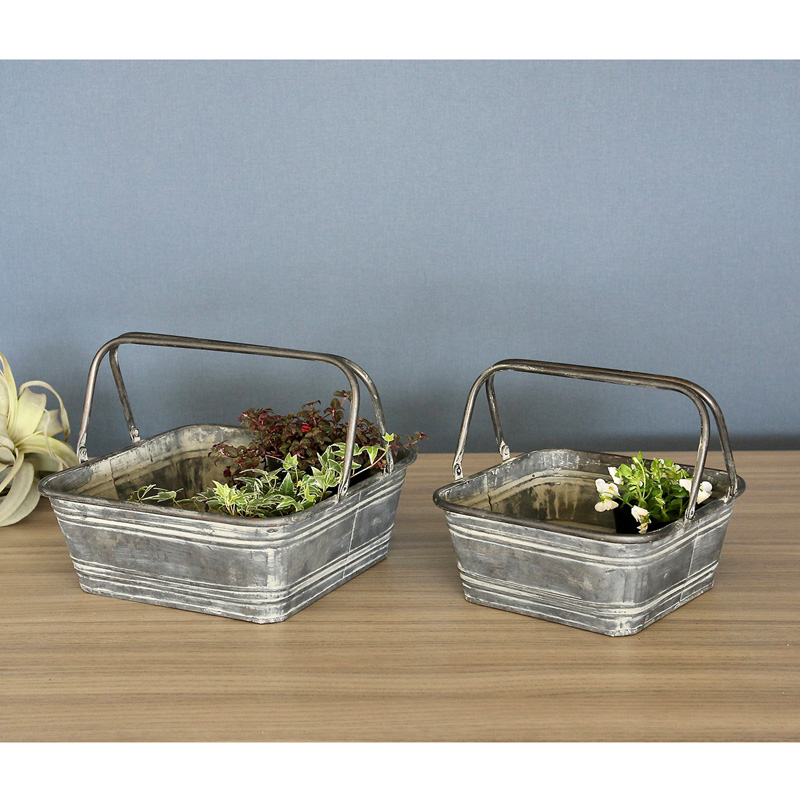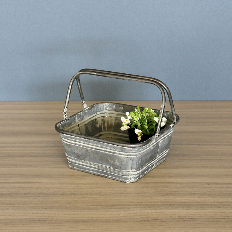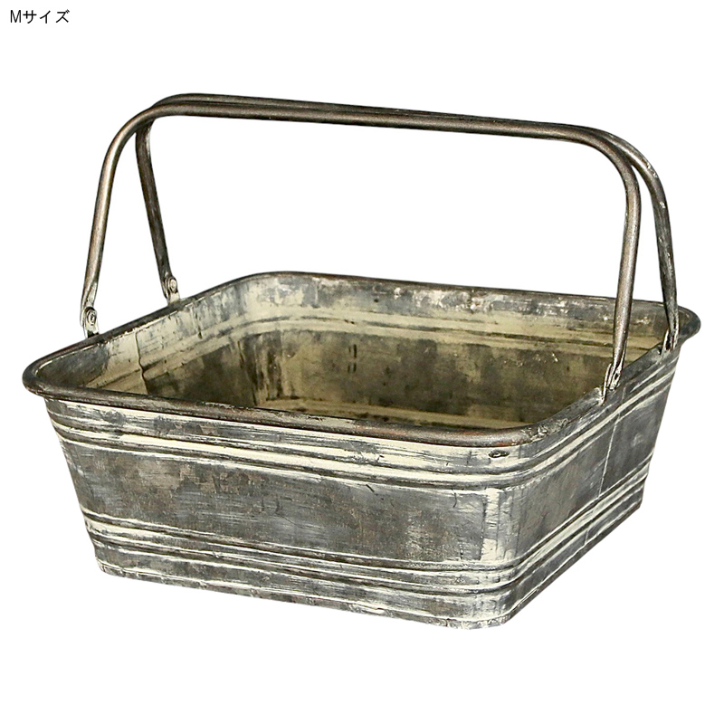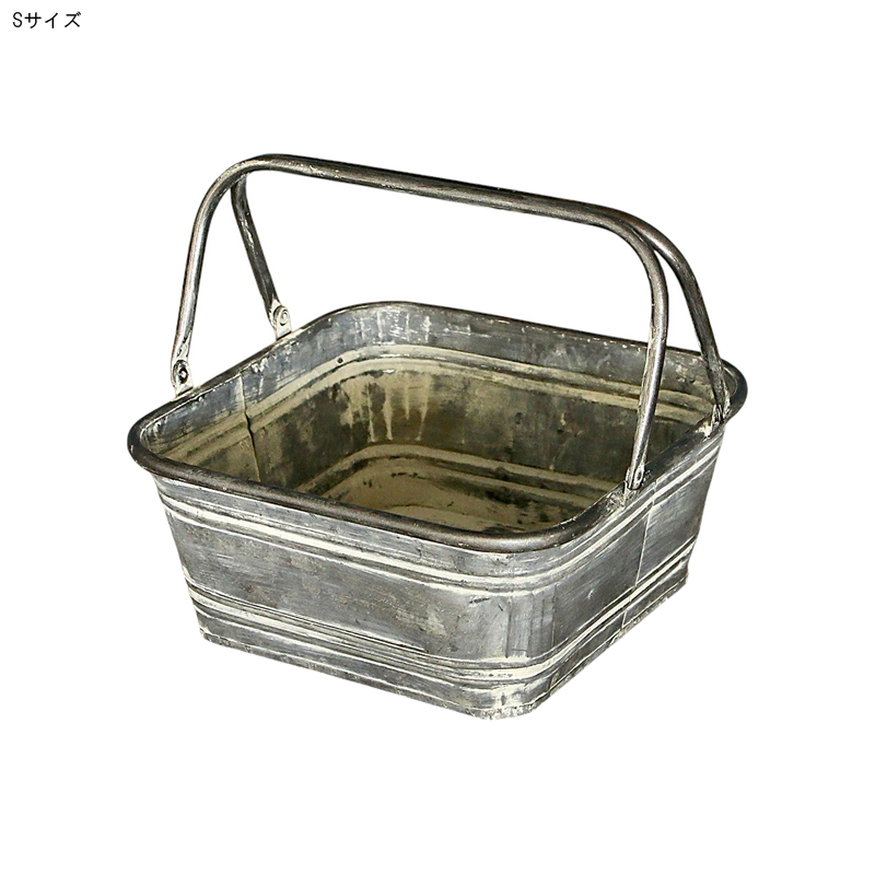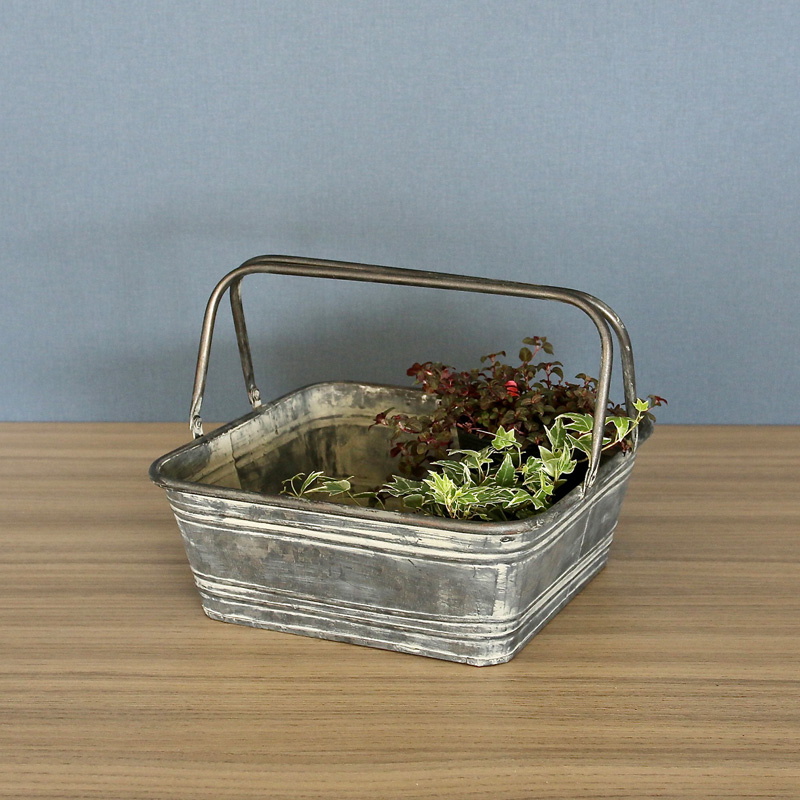 無骨なブリキ素材にハンドルを組み合わせたレクトバスケット。