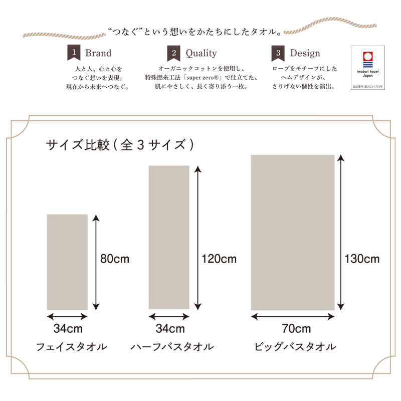 | サイズ | フェイスタオル:約34×100cm ハーフバスタオル:約34×120cm ビッグバスタオル:約70×130cm |
