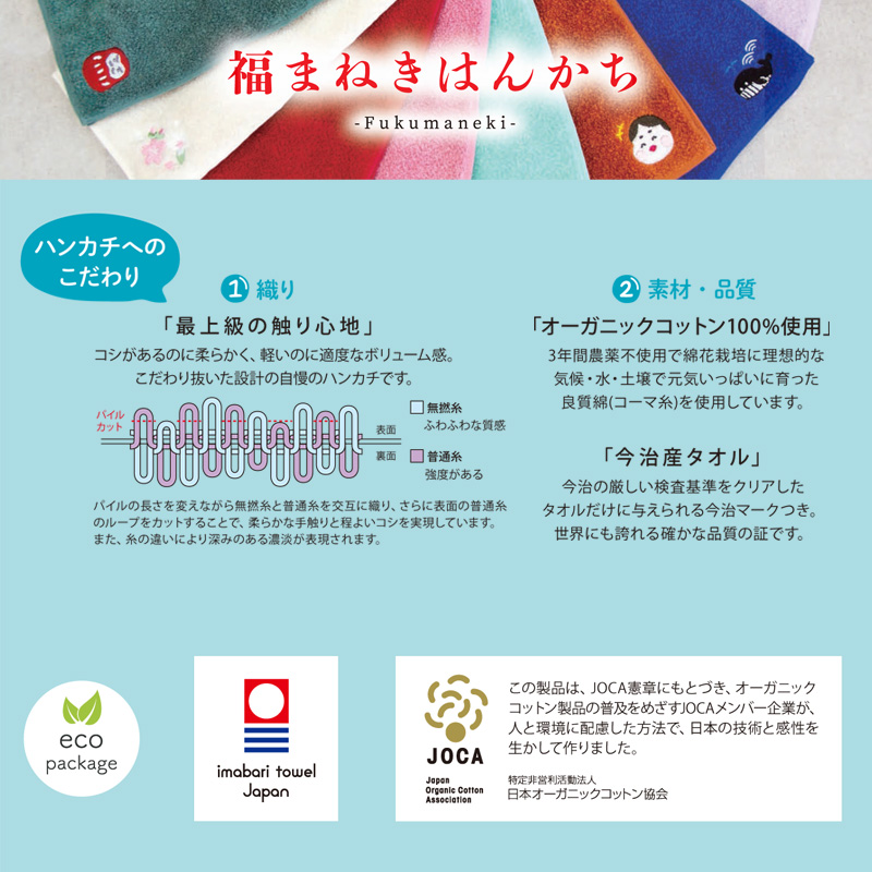「福まねきハンカチ」は、今治製ならではのやさしい使い心地に